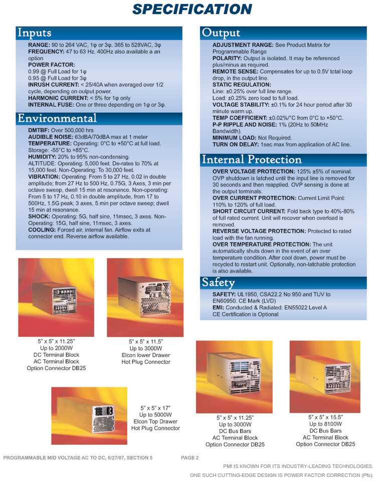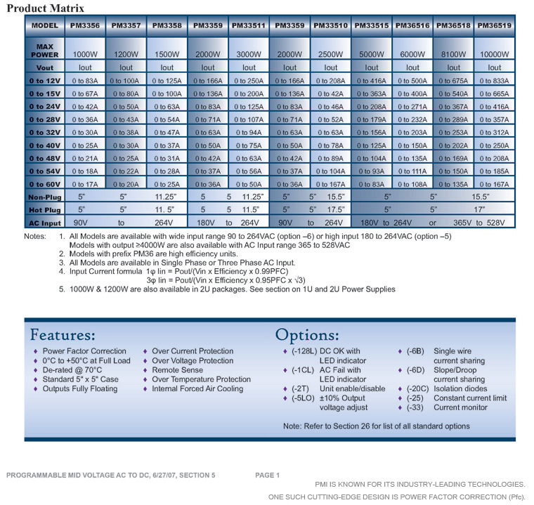 Pioneer Magnetics introduces a new breed of High Efficiency Programmable Mid Voltage PFC Models that provide full output power with Single or Three Phase AC Input. Designed to support both standalone and parallel configurations, these models are configured in standard Non-Plug and Hot Plug I/O interfaces. The Premium Quality front ends are rugged, reliable, designed for high performance and come in the traditional 5” x 5” package. With power density up to 25.8 watts/in3, these units are featured with internal forced air-cooling and built-in protection from electrical over-loads.